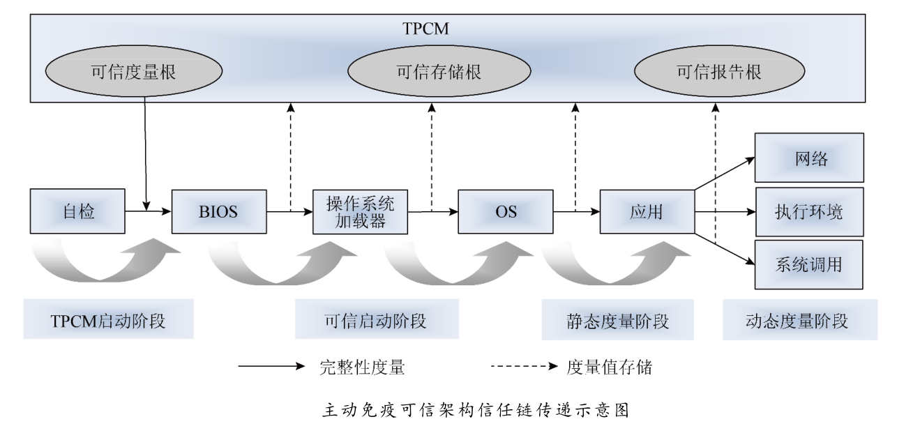 可信的基本思想是在计算机系统中首先建立一个信任根,在计算机系统启动和运行过程中再建立一条信任链,实现对计算机系统局部或全局的可信验证,从而发现不可信实体,及时恢复或阻断运行,从而确保系统安全。